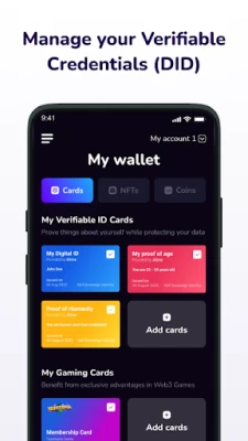 - Securely store and share verifiable credentials like digital ID cards, re-usable KYC, diploma, age verification (over 18), proof of email and more.